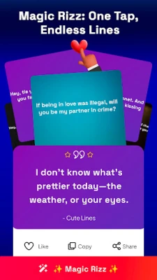 With Rizz Lines App, you’ll always have the confidence and creativity to make a lasting impression. Whether you're a flirting pro or just starting out, this app will help you charm, connect, and win hearts like never before. Ready to charm? Grab Rizz Lines and start flirting smarter today!