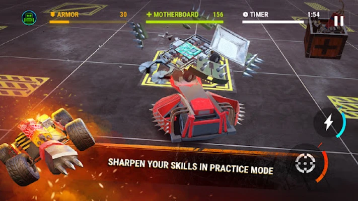 Fight with your super mechs on multiple battle arena locations with additional obstacles – traps, spike strips, kill saws, hell raisers, ramrods, etc. Interact with objects on the battle arena (crates, fire extinguishers) and learn how to use the traps in your favour. Earn experience points in robots fighting games and get access to minibot customization – new armour, weapons and styles for more breathtaking car wars game.