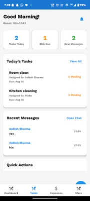 Get a quick overview of your room's financial status, upcoming tasks, and recent activity. See balances, bills, and pending tasks immediately.