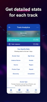 Features available to all artists: •Browse your discography •Preview your tracks •Song/account statistics •View your earnings •Create support tickets •Refer friends •Edit your profile •Connect your social profiles