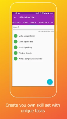 The RPG In Real Life is designed to maintain the motivation for self-development and to gamify your life. We provide a tool for visual tracking of the progress in the development of your individual skill tree, achieving goals and experience level. For motivation we draw parallels between RPG type games and real life where the character that needs to be developed is you.