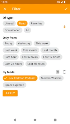 - RSS Reader can filter your feed by channels, time ranges, star, unread - Swipe to mark as read - OPML Import from your RSS Reader - OPML Export - Offline RSS Reader support with Background Sync - RSS Podcast Player - Favorite support - View RSS feed inside the RSS Reader - Background RSS Reader syncing - RSS aggregator - RSS ATOM support - RSS Reader support - Push notifications - Light and Dark theme - Share articles via RSS Reader - Simple RSS Reader