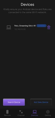 Rukify detects Roku devices on the same Wi-Fi network instantly. Just tap to connect or ❌ remove devices you no longer need. You can also 🔄 refresh with the Search Device button or ➕ manually add a new device by entering its name and IP address.