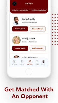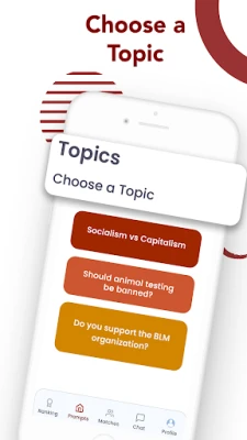 You’ll be matched up with someone who has the opposite stance on the topic you selected to have well intentioned debate and discussion!