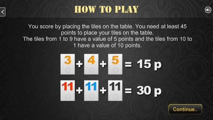The cards from 1 to 9 have a value of 5 points and the cards from 10 to 1 have a value of 10 points. You need at least 45 points to place your cards on the table.