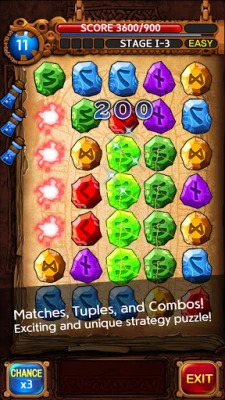 ● You will experience a Tuple when four or more stones are aligned and crushed in a line. A “Match” is for a set of the same color of Rune Stones for 4 or more. A “Double” is earned when you crush two sets of matches with one swap. You will see a “Triple” when you make three sets of matches.