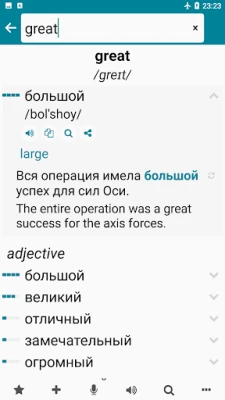 A quick Russian English offline dictionary, alternative translation, irregular verbs, frequently used English sentences, tests (writing, listening, speaking) and games...