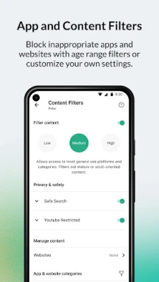 • Proactively manage the time children spend on their phone and restrict app-specific or