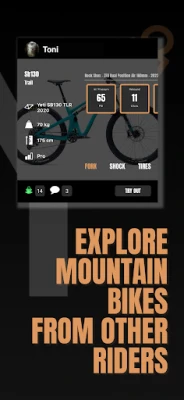 Explore setups from other riders in the bicycle app SAGLY. Search for similar bikes, try out their settings or show off your mountainike with cool images.