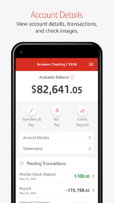 Manage your money anywhere, any time with the Santander Business Banking app. It’s fast, simple, and convenient. You can use the app to check real-time balances, make transfers between your accounts, pay bills, and deposit checks.