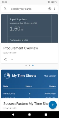 SAP Mobile Cards for Android is a wallet style app used to mobilize enterprise data as microapps. Customizable sample cards include sales orders, products, company news, SAP Inbox, common HR data from SuccessFactors, etc. Key features of SAP Mobile Cards: • Employees can create personalized cards from SAP Fiori Launchpad and SAP Fiori Elements pages. • Administrators can create and deploy cards using prebuilt templates for SAP SuccessFactors, SAP Ariba, SAP Hybris, SAP S/4HANA, and the SAP Inbox. • Administrators can easily create custom cards that connect to any REST accessible system.