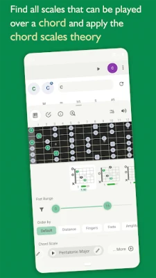 Pocket Composer provides a comprehensive dictionary of all existing chords and scales in western music for piano and stringed instruments. It now supports every stringed instrument with a fretboard, allowing you to apply any tuning to an instrument with 3 to 10 strings.