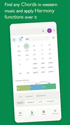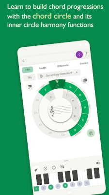 We’ve added a new harmony tool that applies dominant and subdominant harmony functions over all existing chords. The app features a chord wheel that extends the circle of fifths functionality. This allows you to harmonize all scales and even apply harmony functions such as secondary dominant, secondary leading tones, secondary subdominant, etc. This feature helps you compose songs and learn to play chords and scales.