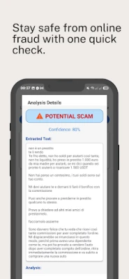 Our app makes it easy to detect potential scams in any conversation. Just upload a screenshot of a chat, and our powerful AI will analyze it for signs of fraudulent behavior.