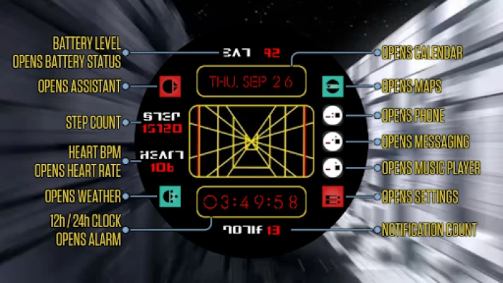 Animated Watch Face with Customizable Displays in Classic Sci-Fi style. This is for Wear OS and Wear OS based smartwatches.