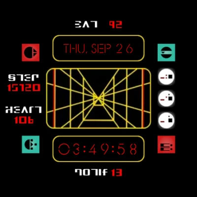 This watch face's interface is meant to parody the way sci-fi designers on a cheap budget imagined future technology over 45 years ago with poor computer effects.