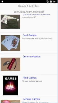 This App contains game ideas for Scouts and Cubs. Not all activities are suitable for both age groups. Most ideas will be suitable for other youth groups in those age ranges.