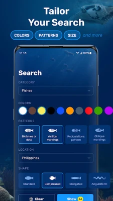 >> Search by color, pattern, location, body shape, social behavior, tail fin shape, etc.
