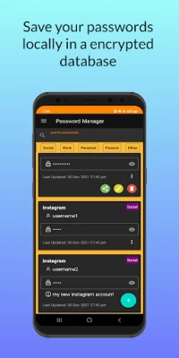 Secure Password Manager is an offline app that will help you to save your passwords on your phone in a local database, where your passwords are encrypted.