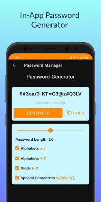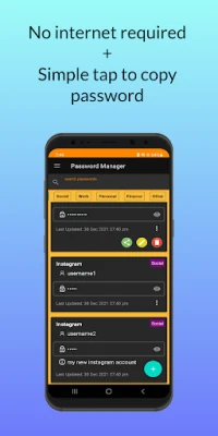 No Internet required. Your data in this app will be on your phone only. You can unlock the app using App PIN or fingerprint. There is also an in-built password generator to generate new strong passwords. You can categorize your passwords into "personal", "work", "finance", "social"