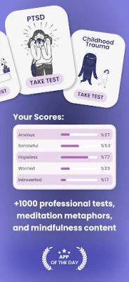 Learn to explore your mind using our app, which contains 77 mental tests! From character and psychology to lifestyle and mood, our tests enable you to continue your personal development by providing valuable insight into the inner world. Specific assessment tests, such as trauma tests, bipolar tests, depression tests, ADHD tests, PTSD tests, and other mental health tests, offer comprehensive treatment to protect and nourish your mental health.