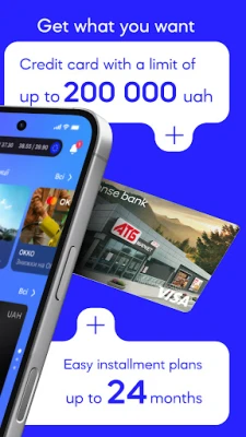 • Easy installment plan — purchase goods and services from our partner network. Max. loan amount - up to UAH 200,000 for a period of up to 24 months. The actual annual interest rate, subject to the conditions of the "Easy Installment Plan" program, is 0.01% (for 3–24 months).
