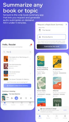 Request Any Book You Need We believe you should never be limited by what's already available. If there's a specific non-fiction book you want to learn from, simply request it through Senszei — and we'll create and deliver the summary to your app, completely free.