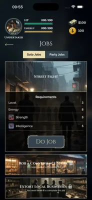 Level up, upgrade equipment, increase stats, and expand your influence across the city. Your criminal empire grows with every decision in this immersive text RPG experience.