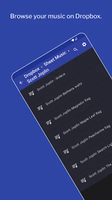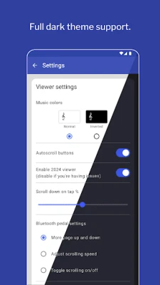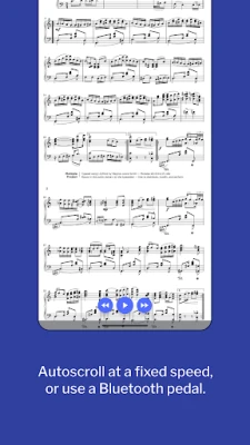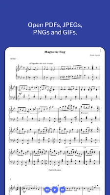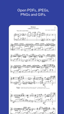 Supported: * PDF, JPEG, GIF and PNG files * Bluetooth page-turner pedals (e.g. Pageflip Cidada) * Dropbox * Auto-scrolling at a fixed speed * Search * Dark mode * Create setlists