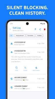 • Smart Call Log: A fully interactive, on-device history of intercepted calls. Filter your blocks by category (International, Domestic, Hidden), export your records, or clear your history with a single tap. For individual entries, instantly see the exact filter that blocked them, or use quick actions to copy, search, and manage specific numbers.