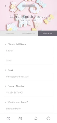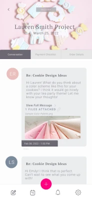 Tap on your accepted inquiry from your list to view all of the project details. In this view you will be able to see their form response, you will be able to message them and view all of your conversations & attachments that may have been sent back and forth, as well as keep track of their payments. All of the details you need for a client's project are in one place.