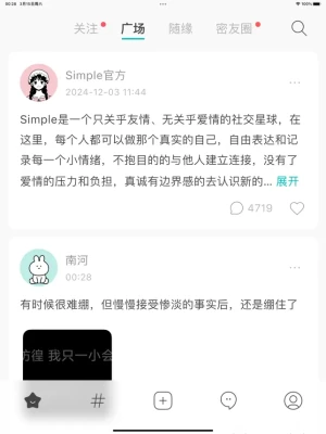 我们相信,简单才是美,简洁的设计才是最好的体验,因此,Simple摒弃了复杂和繁琐的功能,追求简单、清新的界面设计。你无需花费时间去适应复杂的操作流程,界面直观易用,一切都为了让你能更迅速地找到感兴趣的内容或结识新朋友。我们希望你在Simple上的每一次操作,都能感受到轻松与愉悦,而不是被繁杂的通知和无休止的功能干扰。
