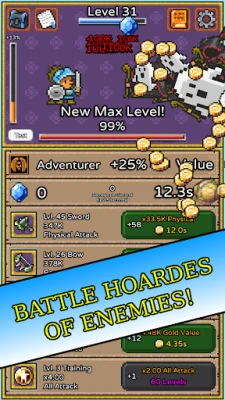Embark on the epic quest of good VS. evil in this refreshingly simple RPG Idle Clicker Incremental! Assume the identity of an Idle Tap Hero as you combat fearsome Monsters in an RPG Quest for loot! Fight -> Loot -> Upgrade -> Rinse and Repeat! There is no choice: advance or die!