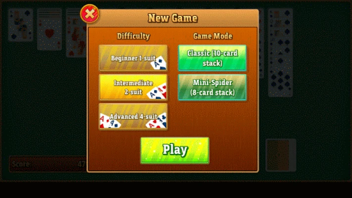 Features: Spider Solitaire with 1, 2 or 4 suits Play classic 10-stack or mini 8-stack Hint and Undo features Customizable backgrounds and card backs