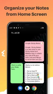 Simple Sticky Notes - Color Notes and Memos is a very simple to use Sticky Notes and memos App in which you can write your Notes, Lists, Tasks, To Do Lists, Things To Remember, Memos etc. and you can manage them from the home screen of your Android Device. You can quickly write down your Tasks and Notes by Clicking on the Widget on your Home Screen.
