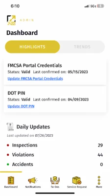 - Our Dashboard provides a holistic view of your fleet and driver performance, which helps you monitor crucial data on inspections, violations, and accidents.