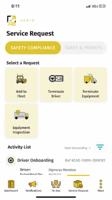 - Empower your Drivers and fleet personnel with self-service functionalities like our Service Requests. Recurring actions like adding Drivers or Equipment to your fleet can be done with just a few clicks.