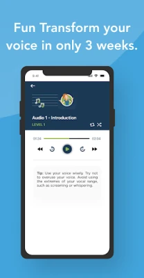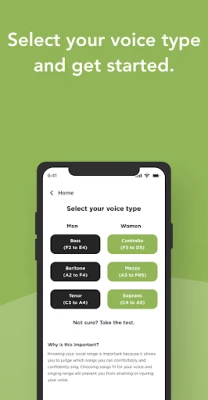 You can select your voice type: (Baritone, Bass, Tenor, Alto, Mezzo, Soprano, Mezzo-soprano) and thus customize the exercises to obtain better results. If not sure what’s your voice type, you can take a test inside the app.
