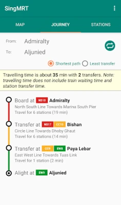 - MRT and LRT map - Journey planner - Station listings - Station information including first/last train timings, amenities, exits and nearby bus stops and bus services.