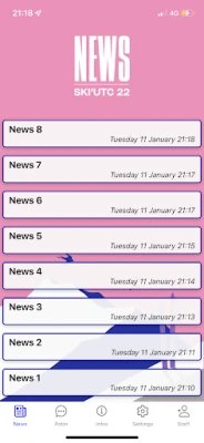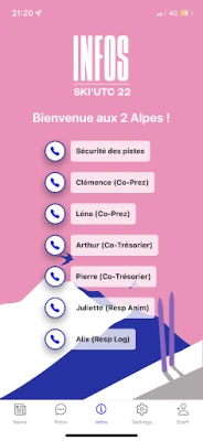 - Actualités et événements sous forme de fil d'actualité - Potins récupérés par la team chaque soir / publier ses potins qui seront en attente de validation par un membre de la team - Page des contacts et informations importante du voyage - Informations importantes sur le voyages et contacts en cas d'urgence