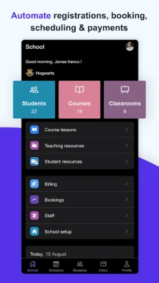 Automate your day to day admin work like student enrollment, invoicing , class scheduling, attendance, course management, daily reports, feedback reports. Run any type of school, academy, coaching or tutoring centre, preschools or daycares, sports, arts, online schools easily from one place. Easily adapt to hybrid mode, online or in person classes.