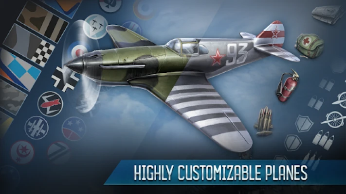 Repaint your plane using unique paintings, collect stickers and customize it. Make your plane one of its kind and stand out on the battlefield.