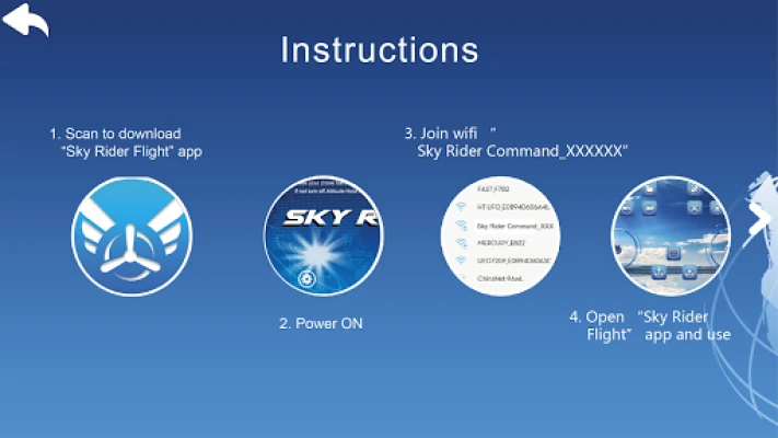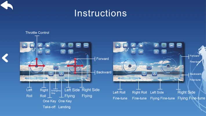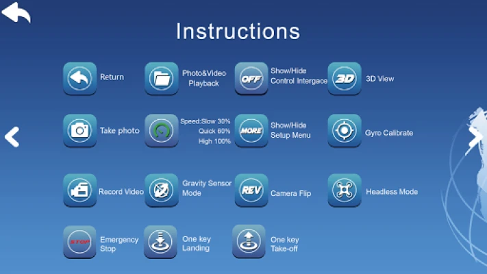 1: Mobile phone can control four axis flying saucer with wi-fi ; 2: Mobile phone can take photos, video; 3: Mobile phone can use four axis controling flying saucer with accelerometer, ; 4: Using the help menu in the APP tell you how to operate this software;