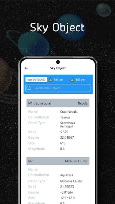 - View information about messier object like Name, Position from earth, Degree, Size, Magnitude.