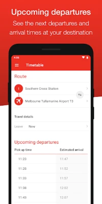 - View upcoming departures as well as timetables for your chosen day and time of travel. See estimated journey times for your trip.