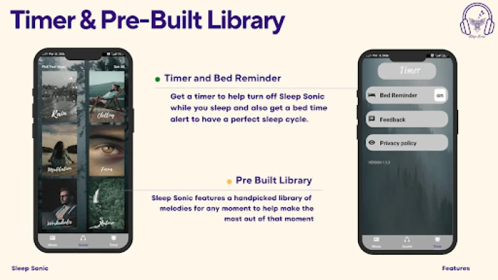 — Schedule the sleep timer to automatically stop the sounds, ensuring a seamless slumber experience and conserving battery life.