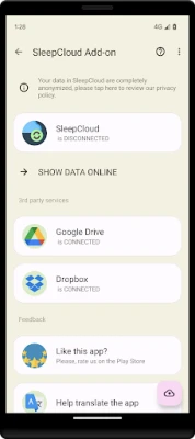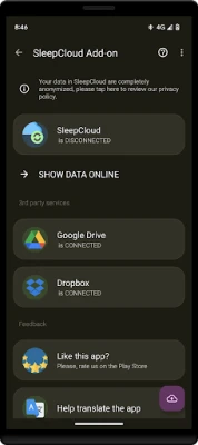 This is an add-on for Sleep as Android to allow backup of sleep graphs to cloud services: SleepCloud, Dropbox and Google Drive. This add-on does not work without Sleep as Android being installed.