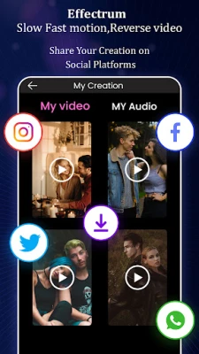 All Video Editor Effect, Slow Fast Motion, Reverse video Editor App allows you to edit videos from your gallery and publish them in the storage of Android cell phones. Get this mighty yet easy-to-use story maker for sharing on social media platforms such as Facebook, Instagram, YouTube, Twitter, Telegram, Vimeo, and many more.
