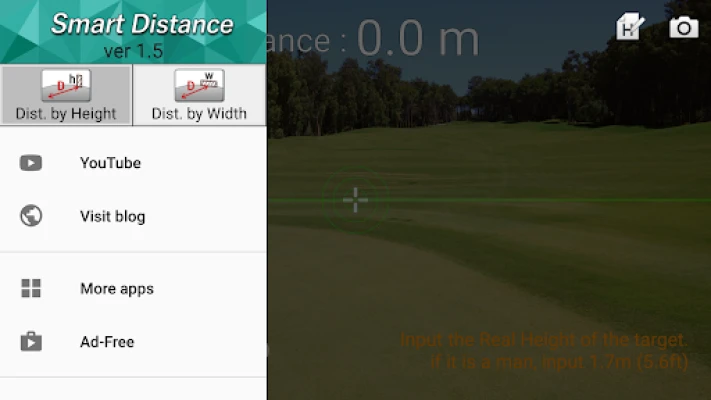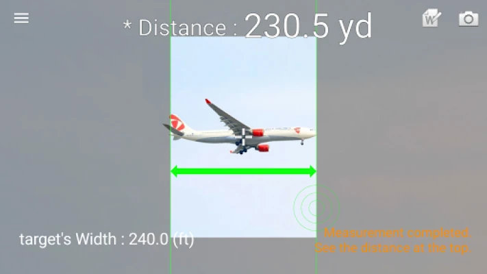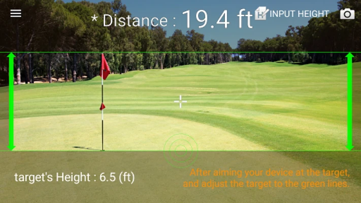 Usage is simple: Enter the height (width) of the target, and touch the screen. When the target is aligned by 2 green lines, get the measured distance.