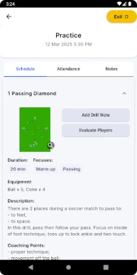 Smart Coach++ app has a built-in drill library but you can also add own drills by hand or import them from our second app: ”Coach Tactic Board for Football.” Once you’re prepared to practice, you can enter ”Practice Mode,” to check attendance and begin practice. Here, you can evaluate each drill and add notes.
